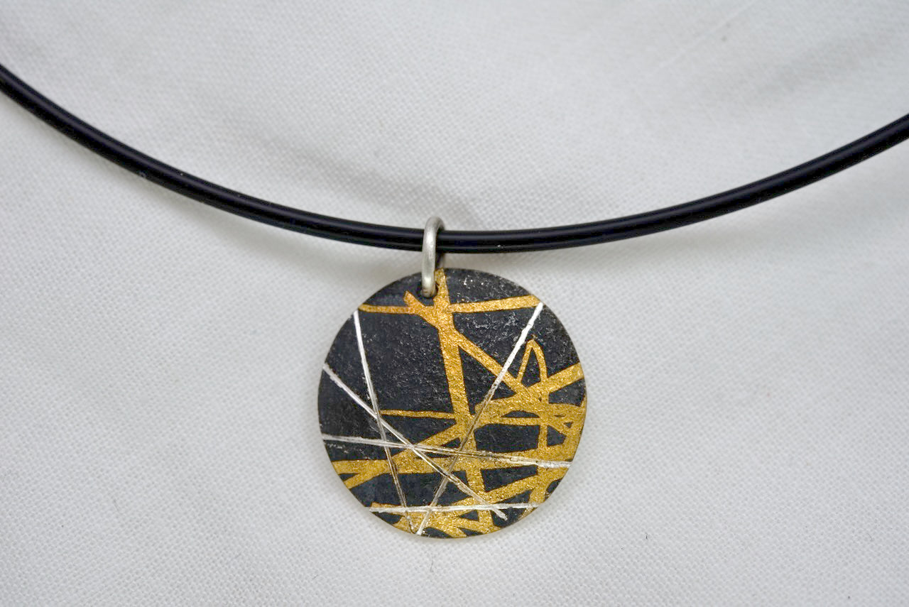 Anhänger gefertigt in der koreanischen Schmiedetechnik KeumBoo. Geschwärztes Silber mit Feingold. Leicht konvex. Grösse des Anhängers 22mm. Das Halsband ist nicht im Preis enthalten.