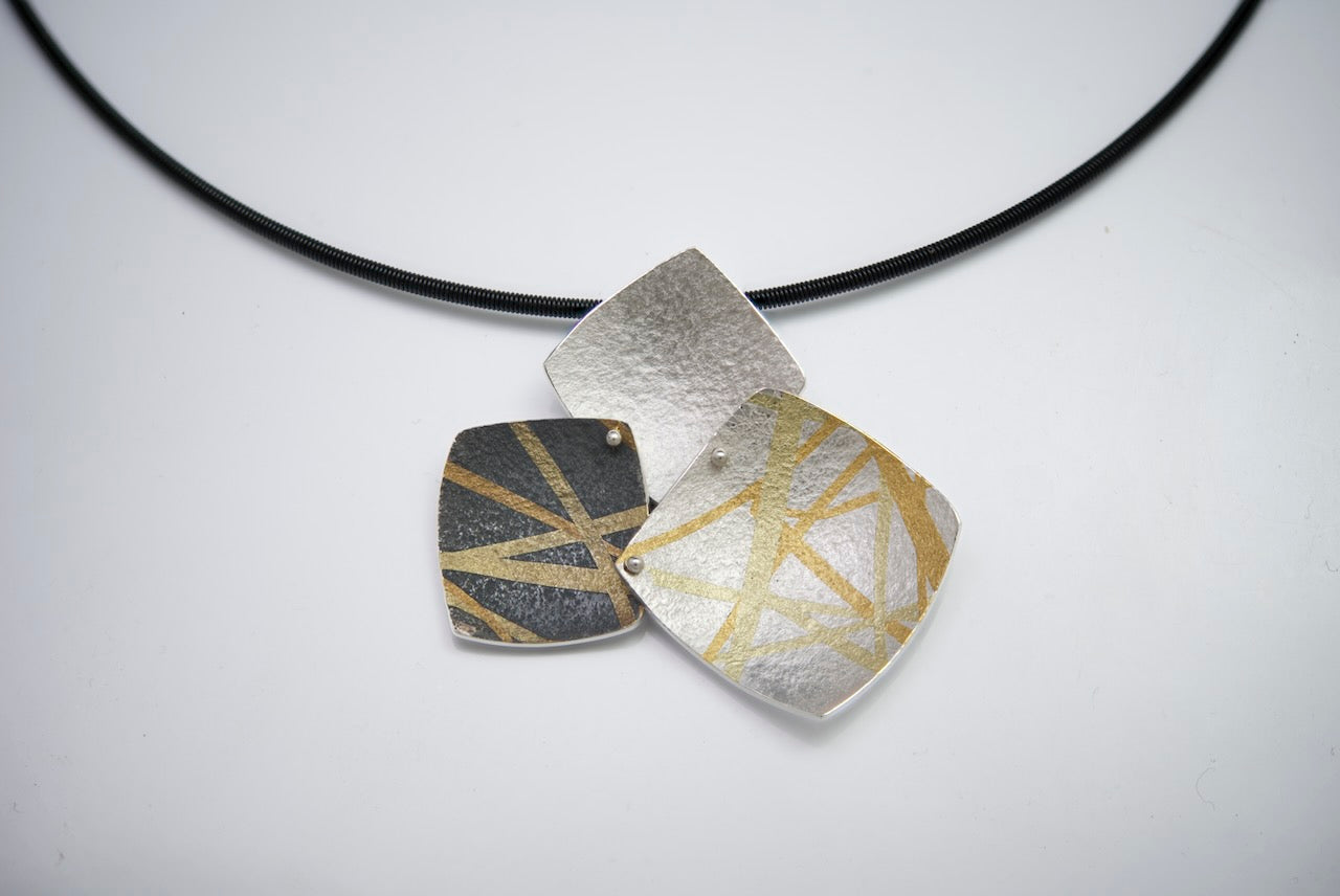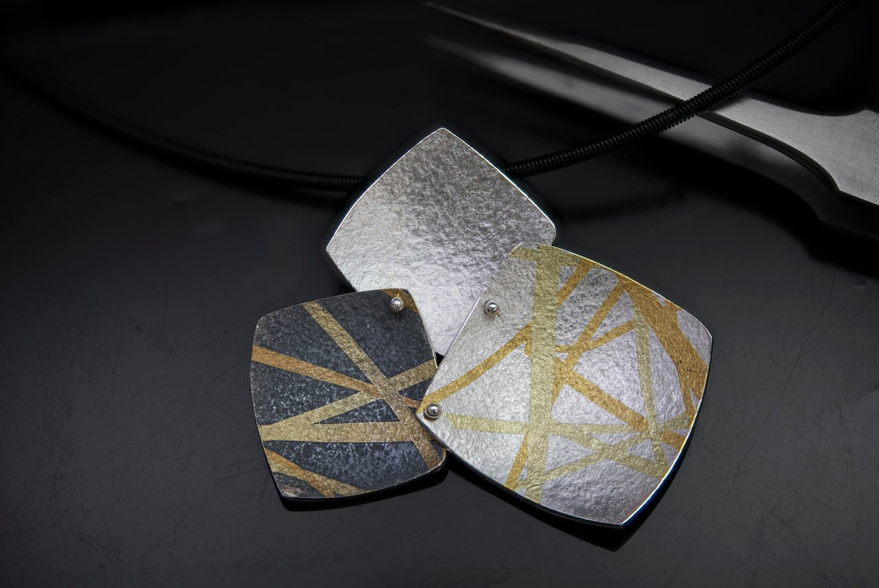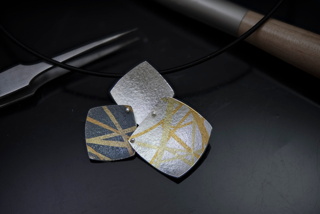 Raffinierter Anhänger dreiteilig in der koreanischen KeumBoo Technik handgefertigt. Silber mit Décor in Feingold und Grüngold 750 teilweise geschwärzt.