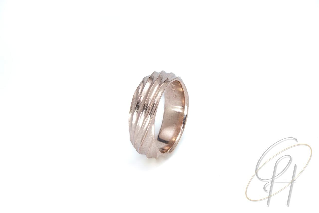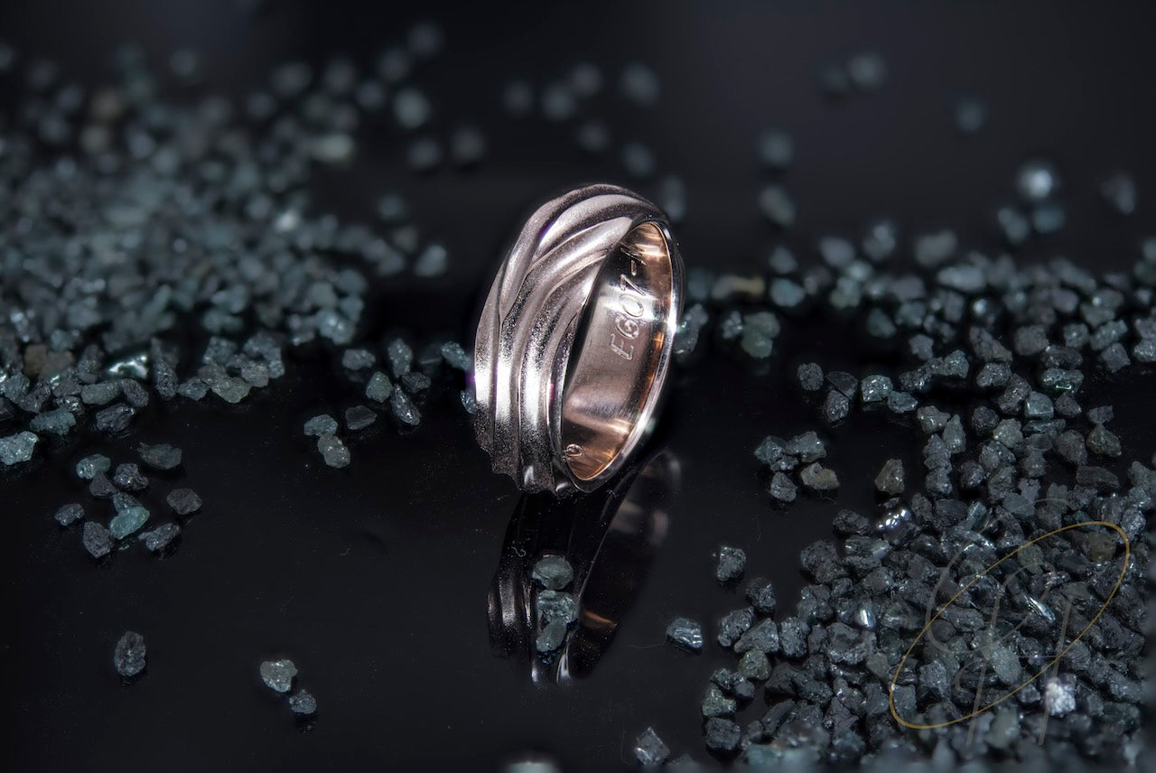 Das Design "Aurora" ist inspiriert von den Nordlichtern, die wir in Schweden sehen durften. Das Muster ist in Mauve-Gold 750 gefertigt. Diese 18 Karat Goldlegierung habe ich selber entwickelt mit dem Gedanken, eine Farbgold Legierung anbieten zu können, die im Gegensatz zu Gelb- und Rotgold einen kühlen Farbton hat.