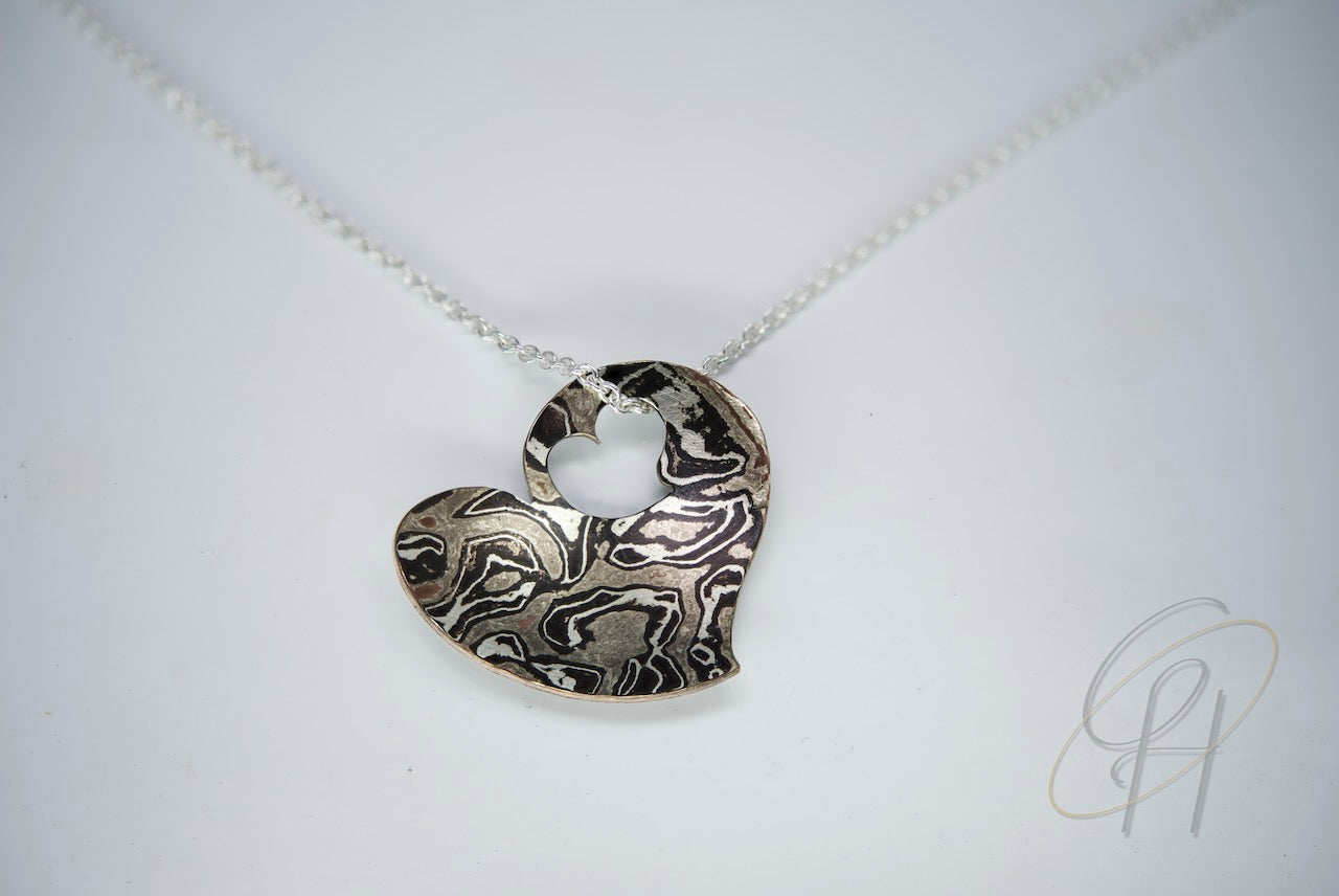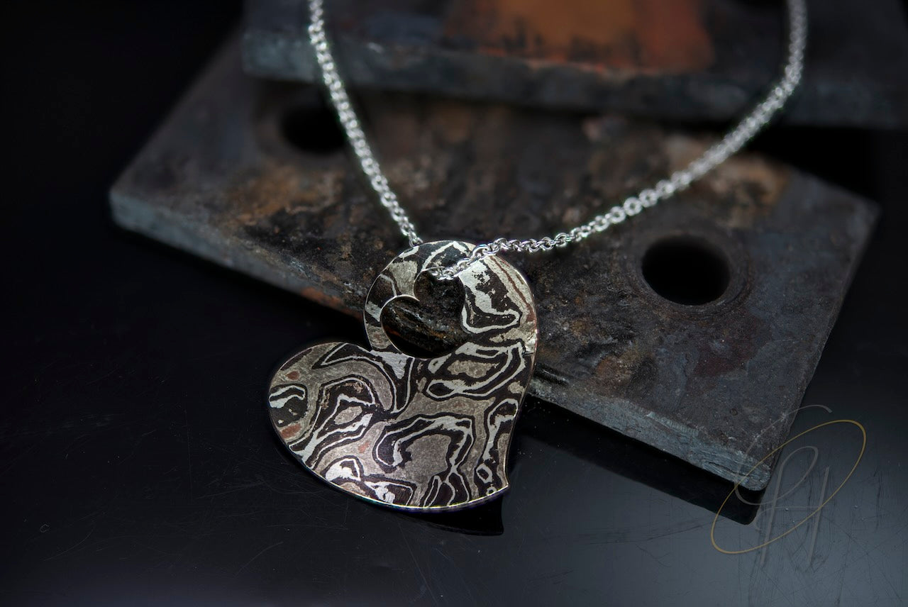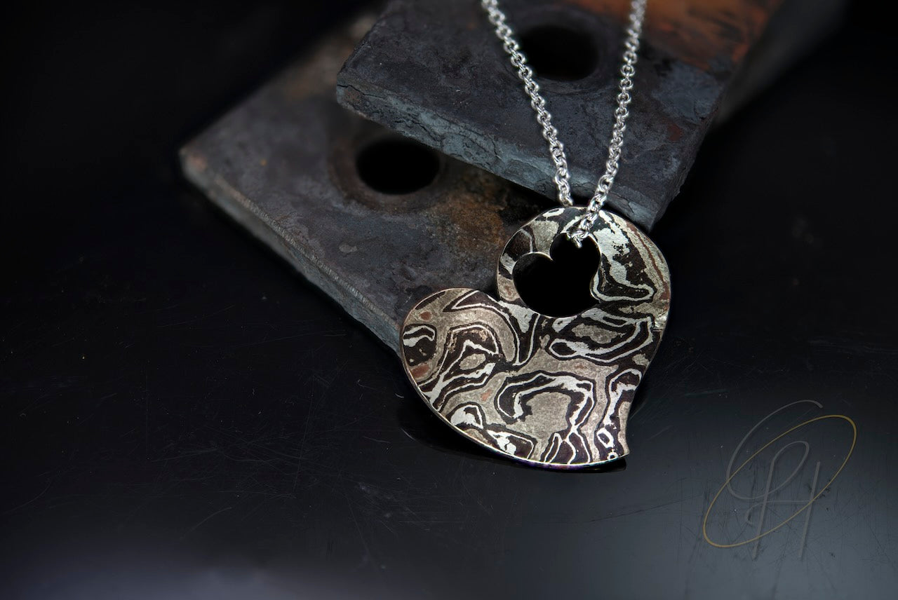Ein weiterer einzigartiger herz Anhänger in traditionellem Mokume Gane handgeschmiedet. Er besticht durch die markanten Farbkontraste von Silber, Kupfer, Shibuichi und Shakudo. Die Kette ist nicht im Preis inbegriffen.