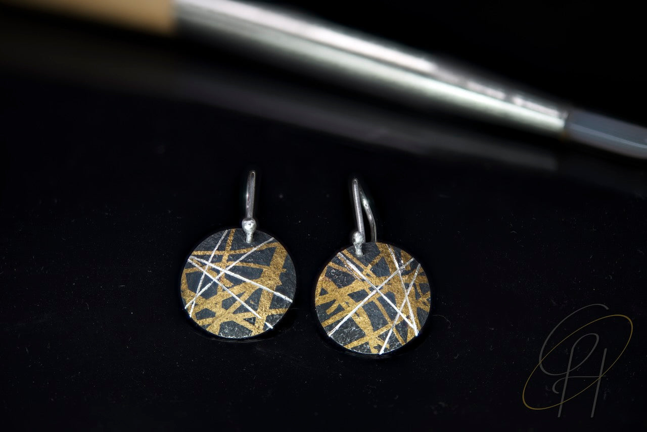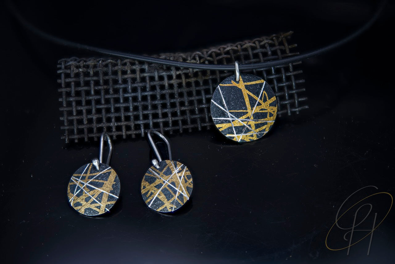 Dieses tolle Set besteht aus Anhänger und Ohrschmuck in geschwärztem Silber mit Feingold gehämmert. Die Schmuckstücke können auch einzeln gekauft werden.
