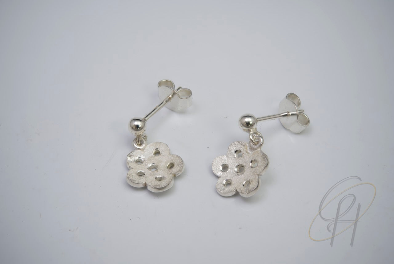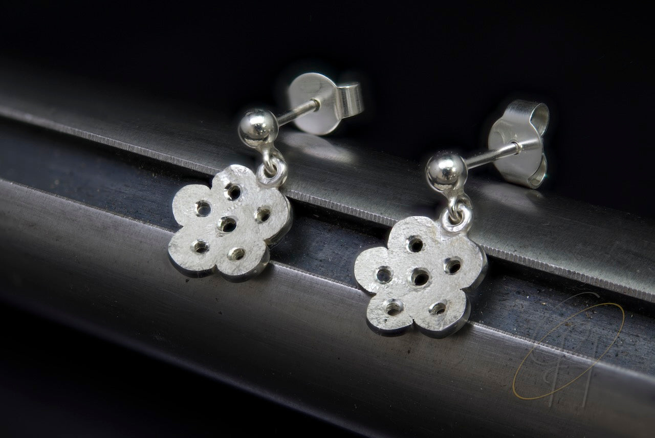 Kleine, feine Ohrhänger Blümchen in Silber mit strukturierter Oberfläche und markant glänzenden Kanten
