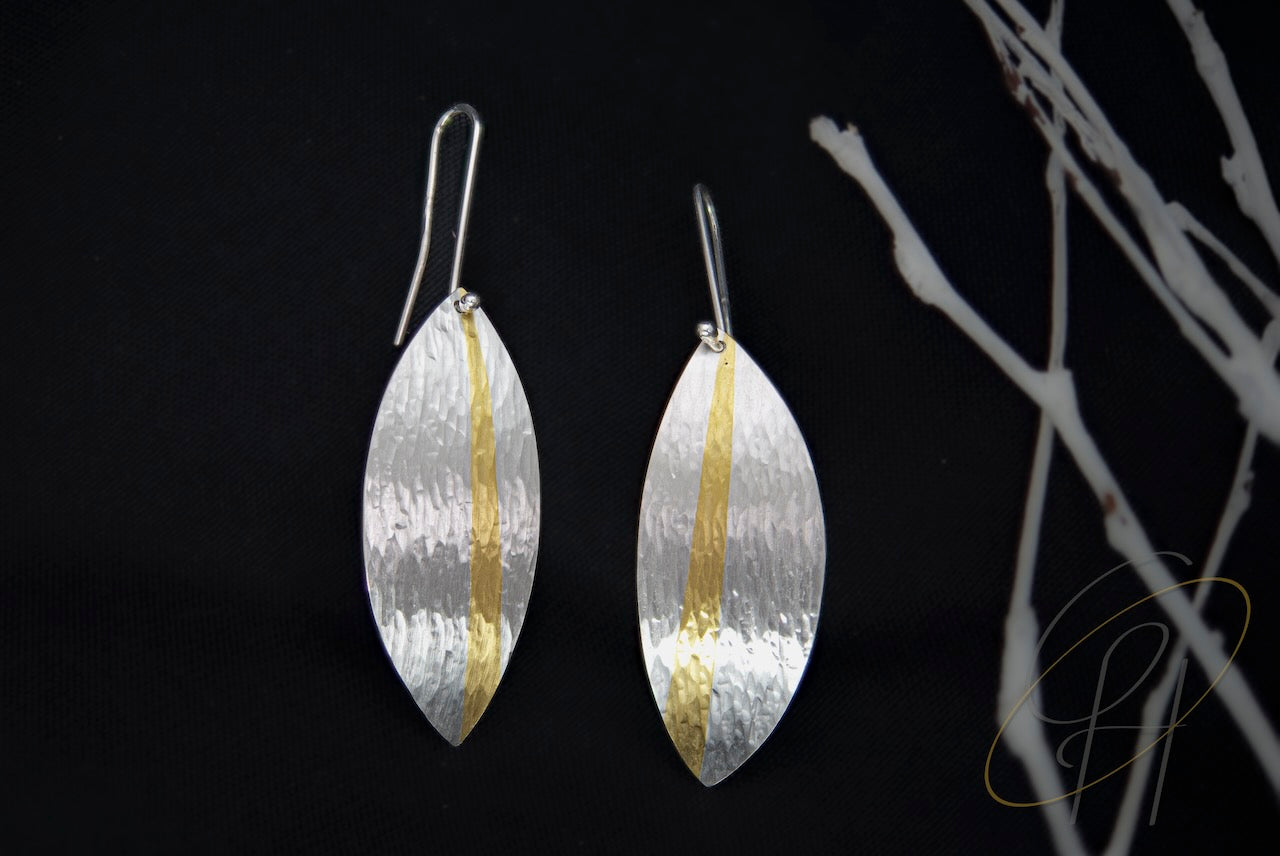 Markante Ohrhänger in der Koreanischen Technik KeumBoo gefertigt. Silber 925 mit Feingold gehämmert und gebürstet.