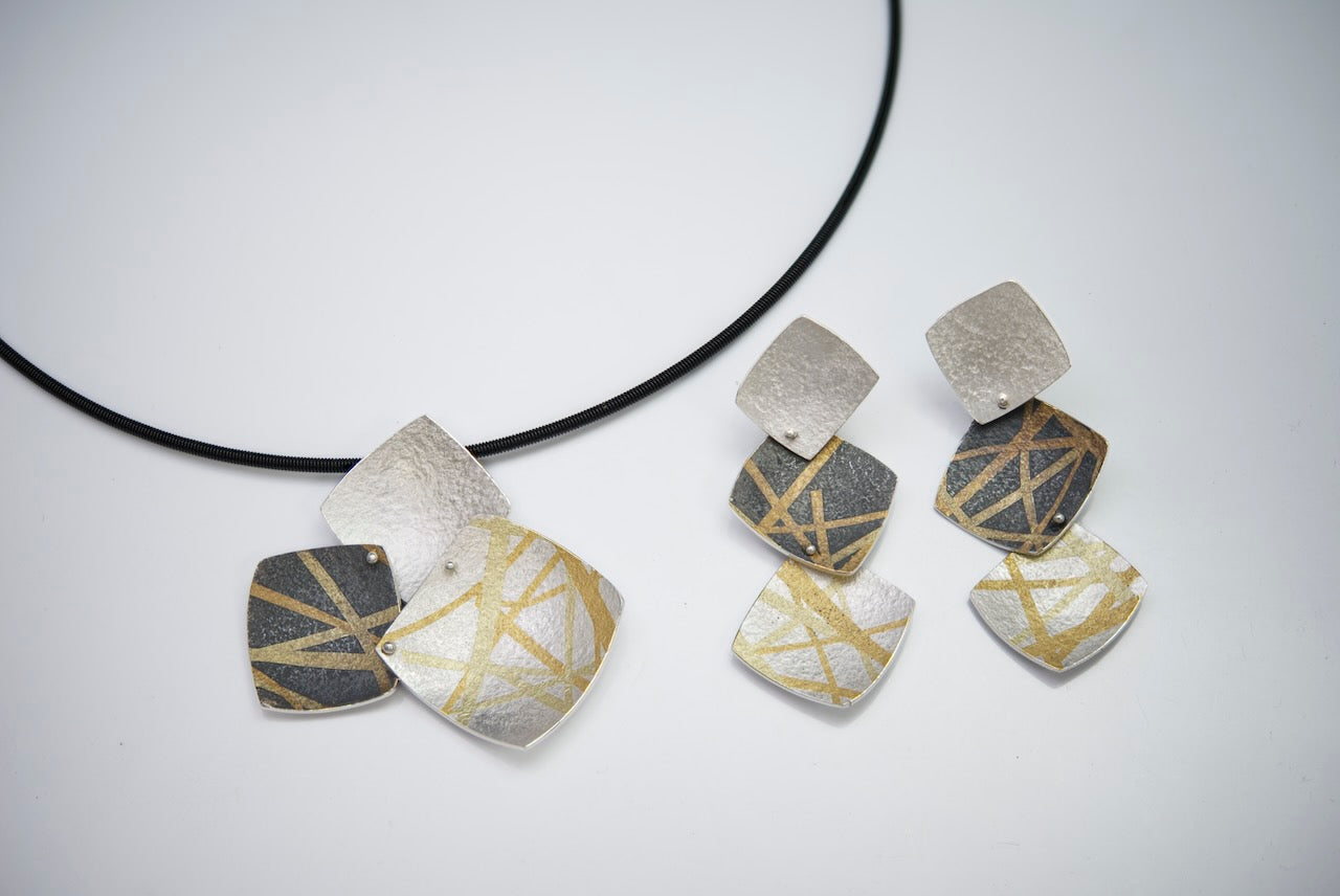 Dieses Set ist in der Koreanischen KeumBoo Technik gestaltet. Die Dreiteiligen Schmuckstücke sind in Silber mit Feingold und Grüngold dekoriert, teilweise geschwärzt.