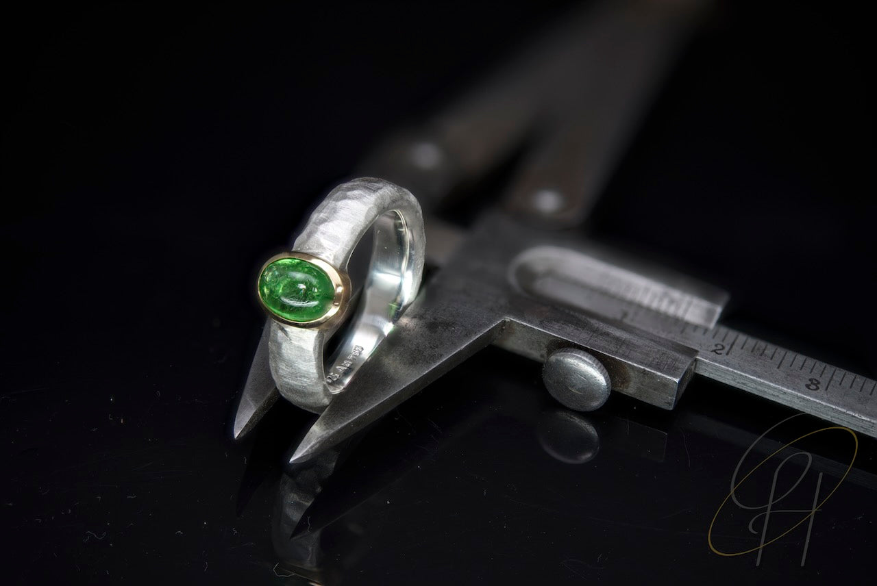 Dieser archaisch wirkende Ring ist mit einer gehämmerten Ringschiene in Silber gebürstet gefertigt. Die Gelbgold Fassung umschliesst den grasgrünen Tsavorith Cabochon und lässt ihn optimal im Licht wirken. Der Ring ist in Grösse 53 gefertigt. Für eine Grössenänderung kontaktieren Sie mich bitte.