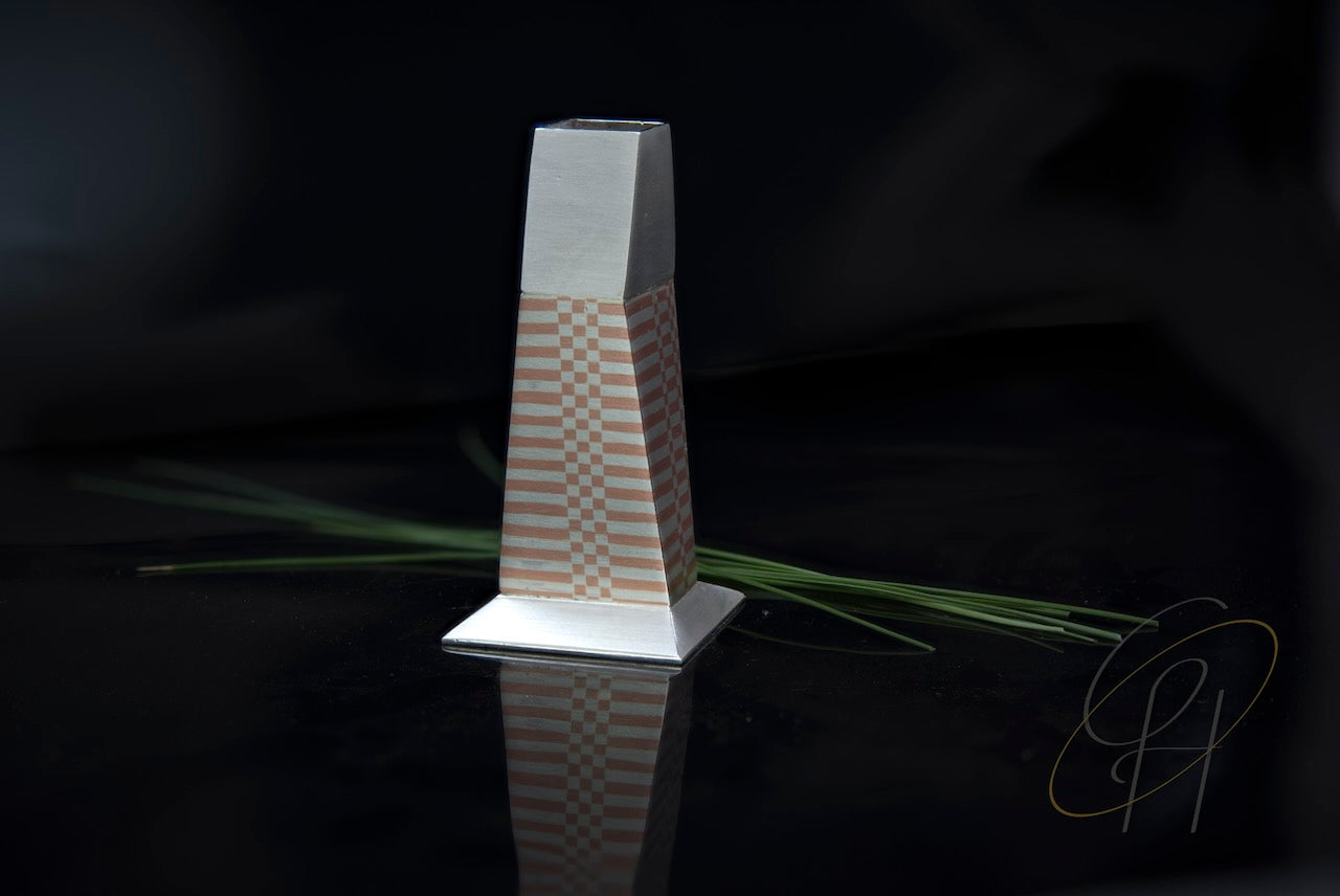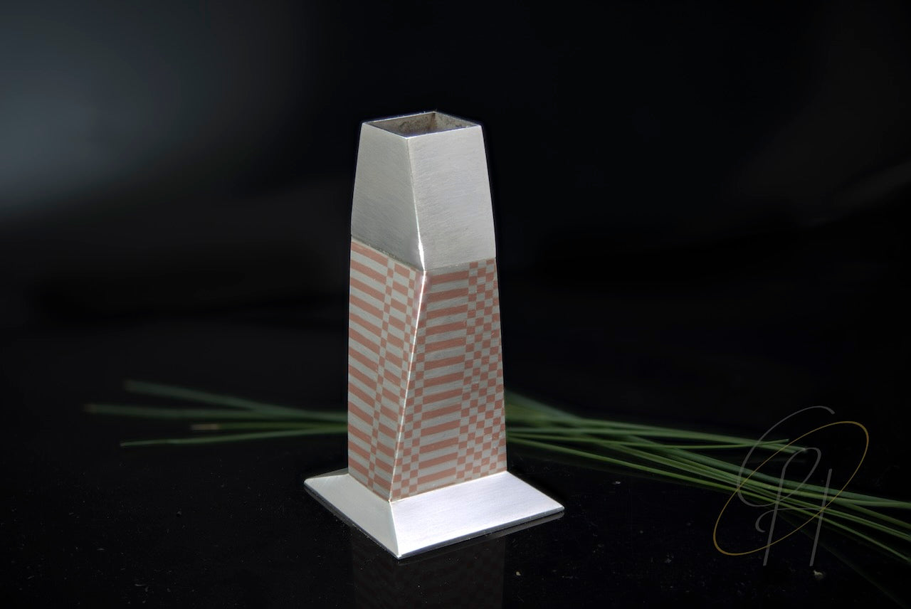 Kleine, moderne Vase in freestyle-Mokume Gane Technik, Silber und Kupfer. Die Vase ist handgeschmiedet und montiert, ein weiteres exklusivers Einzelstück aus meiner Handwerkstatt.
