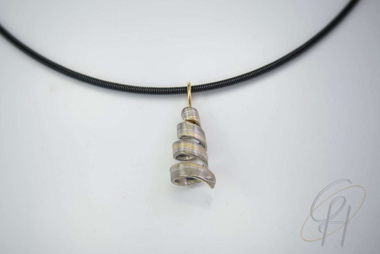Anhänger Mokume Gane in Silber, Palladium und Gelbgold verspielt, drehbar.