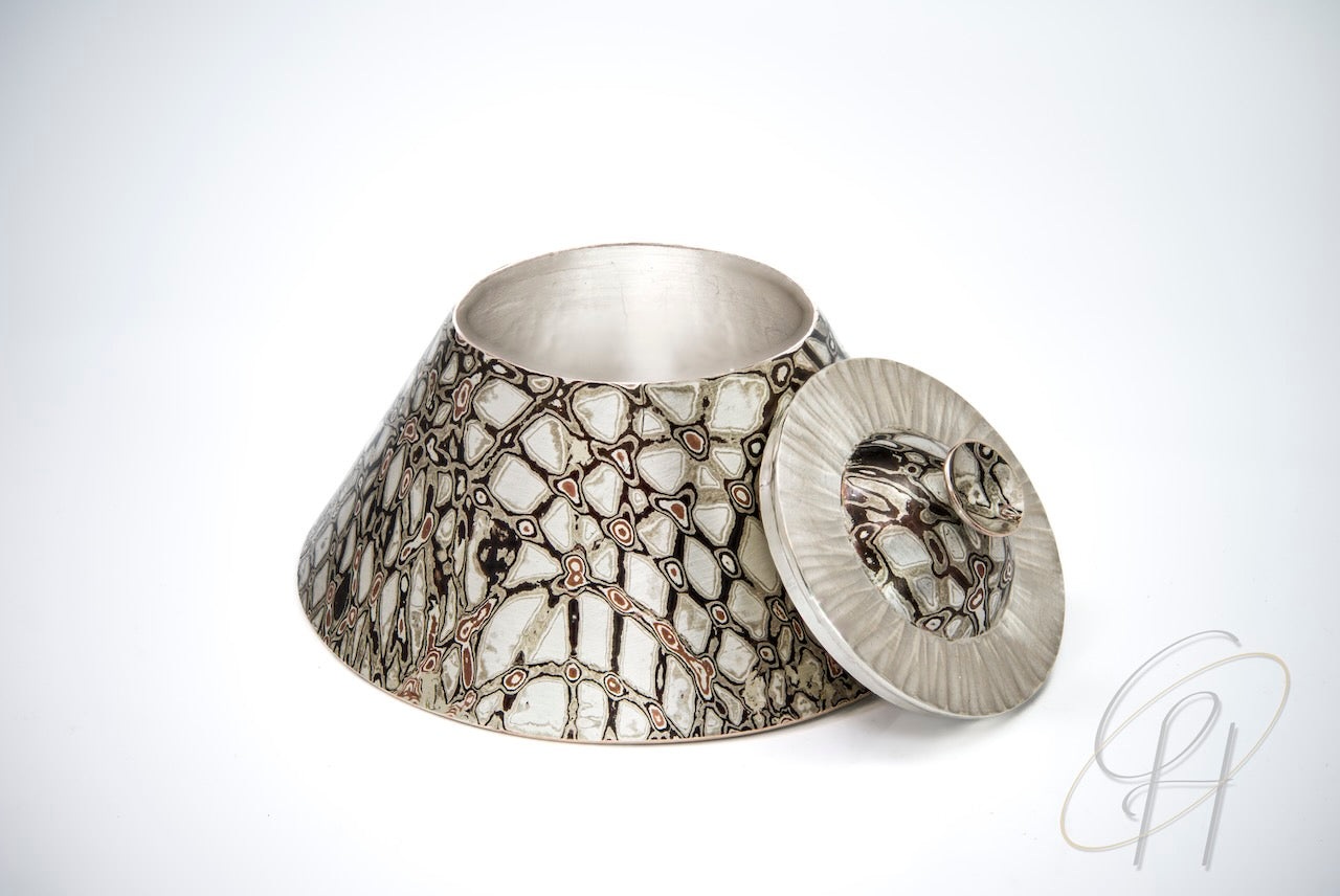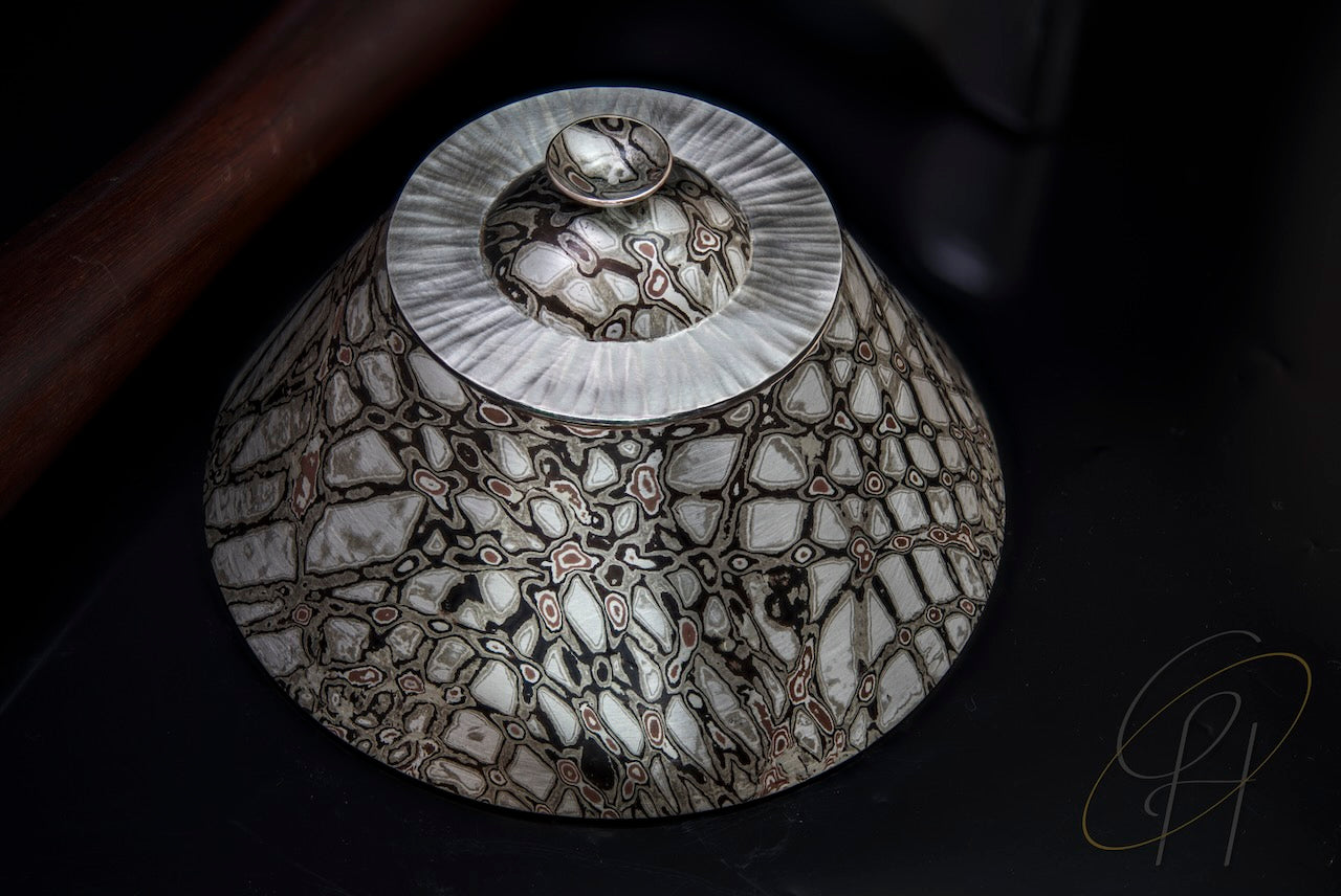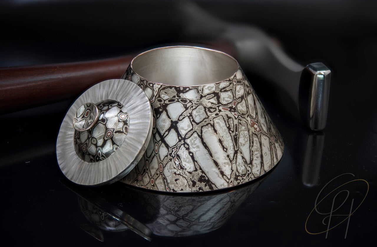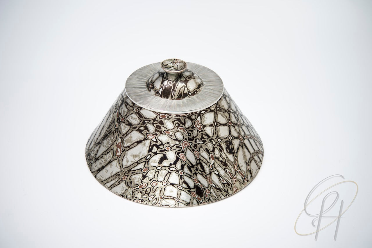 Dose mit Deckel angefertigt in der japanischen Mokume Gane Schmiedetechnik in Silber 925, Kupfer, Silber 999, Shibuichi und Shakudo. Handgeschmiedetes Einzelstück aus meiner Mokume Schmiede. Max. Durchmesser 85mm, Höhe mit Deckel 47mm