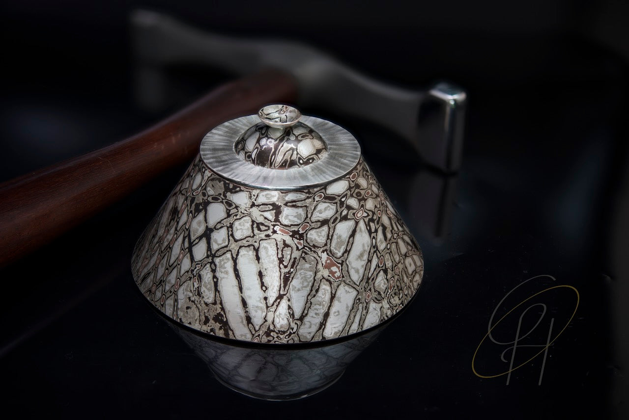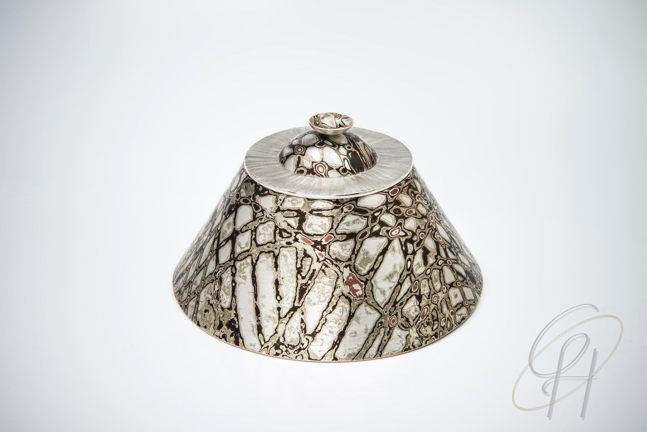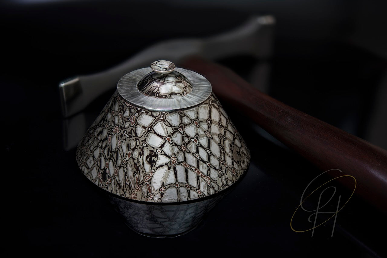 Dose mit Deckel angefertigt in der japanischen Mokume Gane Schmiedetechnik in Silber 925, Kupfer, Silber 999, Shibuichi und Shakudo. Handgeschmiedetes Einzelstück aus meiner Mokume Schmiede. Max. Durchmesser 85mm, Höhe mit Deckel 47mm